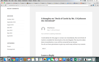 And some of these sites are impossible to contact. The ones that did have contact buttons got an ear full, believe me, and my threats of sending in lawyers are no joke either (as soon as I can find one who has a few spare moments and works for peanuts, like me.)Who do these people think they are? And more importantly, who in the world would dare use these sites? Don't they know they are stealing? Do they care? If you really want to read my book that badly for free, let me know and I'll send it to you! But don't take it without asking. That's just wrong.