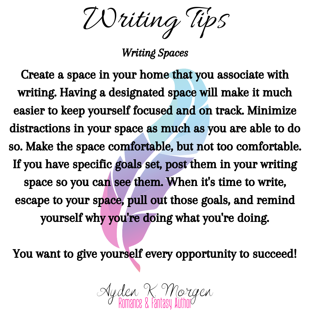 Creating a writing space can help minimize distractions, and keep you focused and on track. It doesn't have to be fancy, nor does it have to require thousands of dollars in renovations and makeovers. Find a quiet place and make it comfortable (but not too comfortable). When you need to focus, escape to your space and get busy!