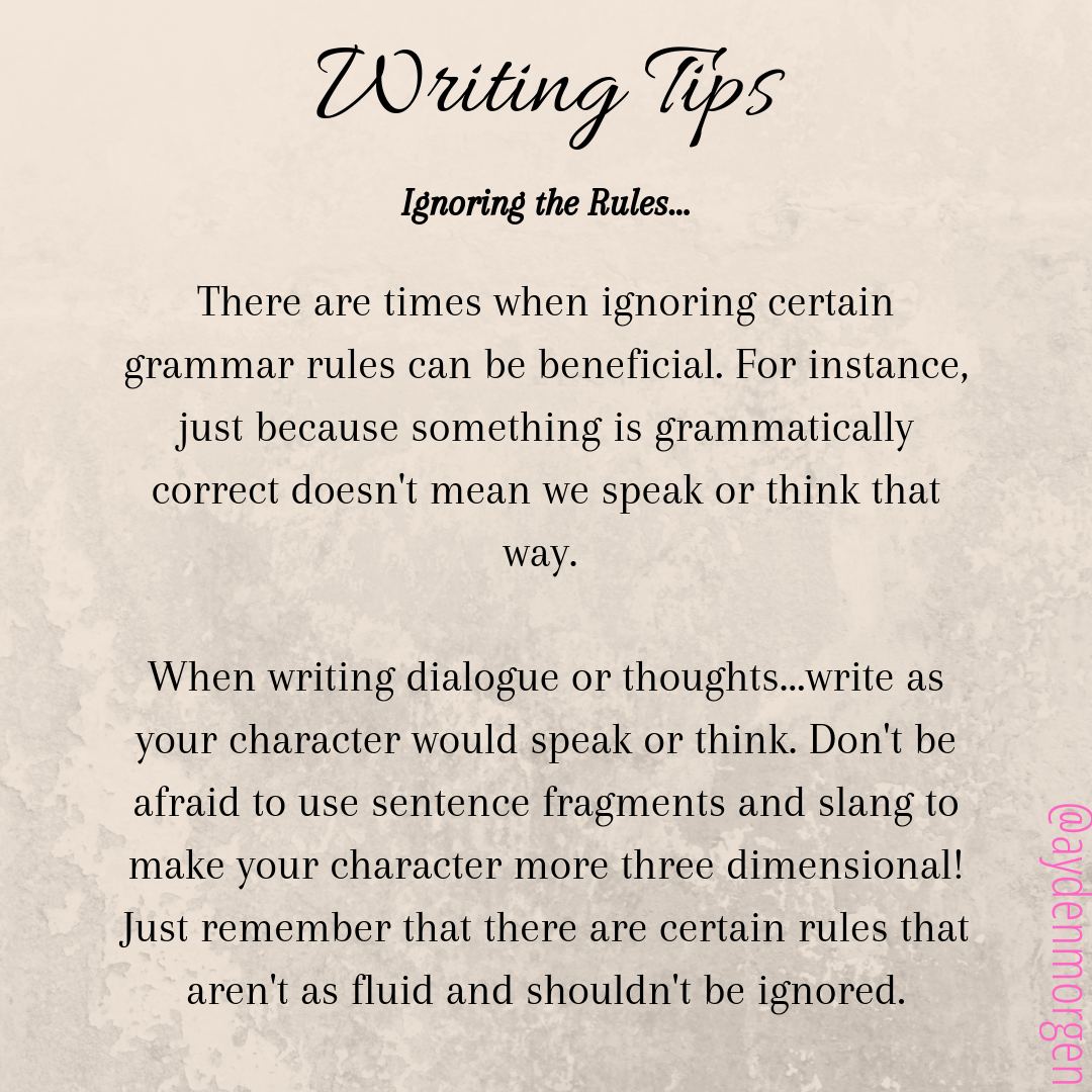 You want to write believable characters...and we aren't a world full of English majors! Use sentence fragments and slang. Drop the "g" at the end of certain words. Give your character a stutter. None of these follow the rules, but they can make a huge impact on the ability of readers to relate to your characters. Sprinkle these rule-breakers in to make your characters more three dimensional and believable.