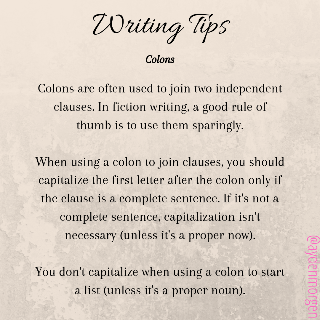 Colons are powerful tools, but in fiction writing, should be used as sparingly as possible. Colons are most frequently used to join two independent clauses, as well as to start lists and introduce quotes.