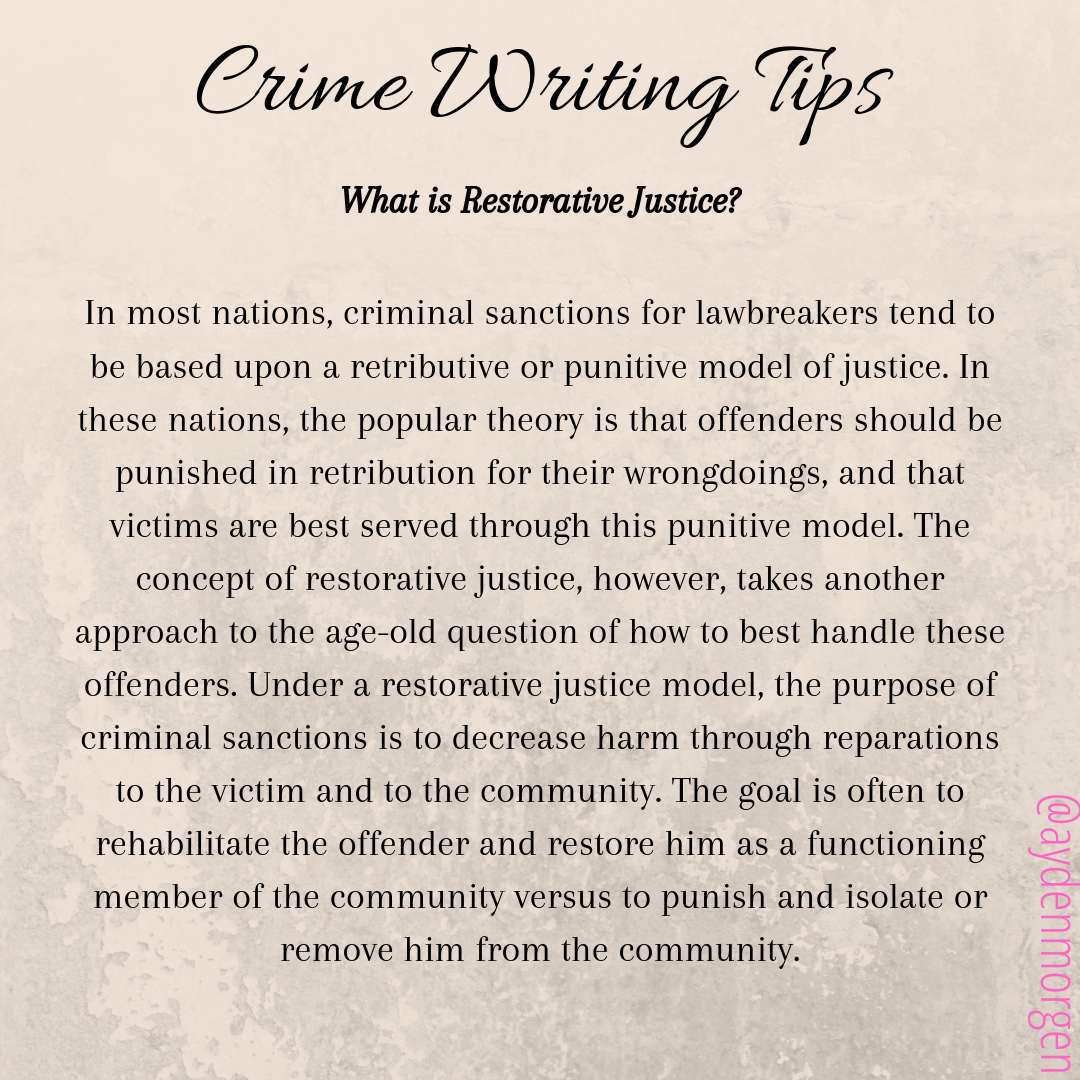 Well, unlike a punitive or retributive model of justice, a restorative model seeks to rehabilitate offenders and restore them as functioning members of society. This is done through things such as victim/offender mediation, community service, circle sentencing (where the victim and offender both participate in deciding a fair sentence), family counseling and rehabilitation programs, etc.