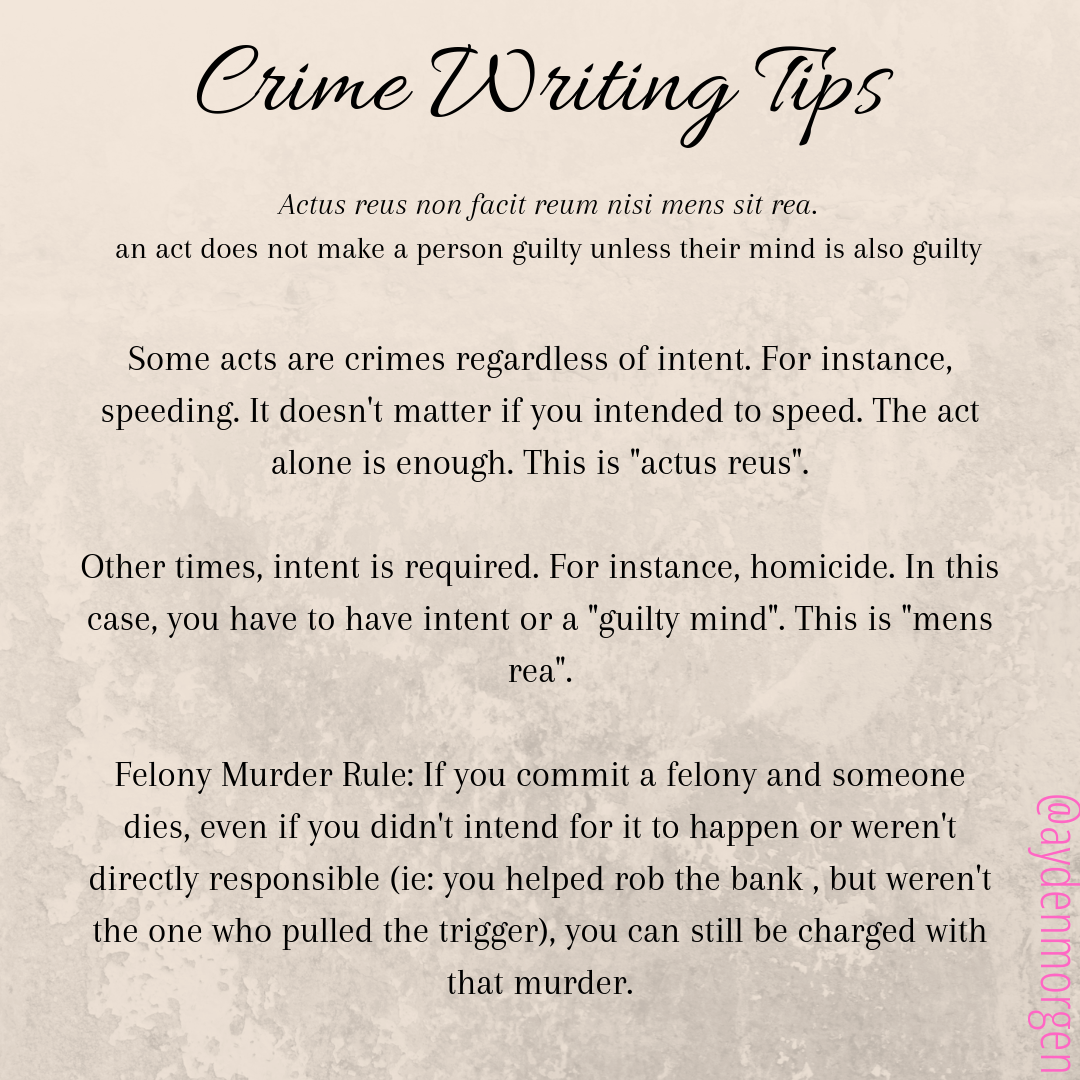 However, in many other instances, in order to constitute a crime, there has to be intent or a "guilty mind". You have to have intended to commit the crime in order to be charged and convicted. This is known as "mens rea". For instance, if you discharge a firearm into the air and it kills someone, you probably won't be charged with homicide because you didn't intend to kill anyone. You were just an idiot. But you can be charged with reckless discharge of a firearm because you committed that act by shooting into the air. You might also be charged with some form of manslaughter because your reckless action caused a death regardless of your intent. But because homicide requires malice aforethought (or intent), which you lacked, you can't be charged with homicide.