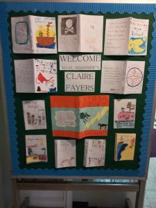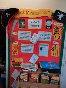 Deri View are awed by the author’s thinking positionThen a quick pop home for the weekend before I caught the train back up to Shrewsbury for the Bookfest, where I covered six classes in five different schools over two days. The welcome was overwhelming. I didn’t manage to get many photos but I’ll never forget walking into a class to see 32 children wearing pirate hats and waving flags. And the Mirror Magic display in Bicton Primary school – fan fiction, drawings of new characters for the book and a display of magical hats each with their own power.