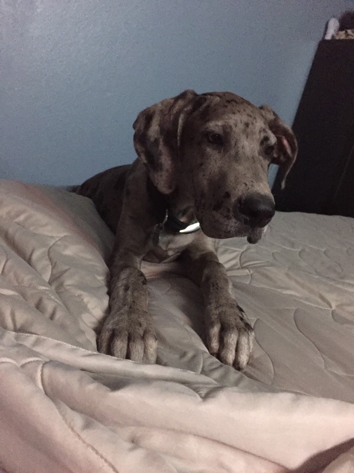 Bexley is a Great Dane, she's now 4 months old and she is actually reaching the middle of a king sized bed in the photo. :) My princess was given a solo and will begin competing this month!