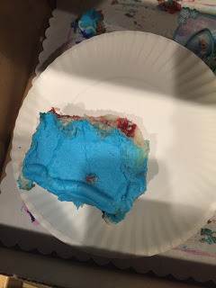 I'm startled awake by a noise, I wait and listen in my sleepy stupor. Nothing. I roll over. Then I hear my youngest tossing around in his bed. I think okay I must have heard him, no big deal. I try to go back to sleep. Five minutes later I hear noises again, this time from the kitchen. I wait to see if they will stop. They don't. I get up and creep into the kitchen, my heart pounding thinking someone is in the house that shouldn't be, as anyone does when there are noises in the middle of the night. I turn the corner, and there I find a head inside my daughters birthday cake box. Thinking I'm looking at my oldest because, well he's taller than the counter. I say "We do not eat cake at 5 o'clock in the morning!" in a stern mom voice. My youngest jumps and bursts into tears. He was standing on a chair. Oops. I scared the living day lights out of him and not because he thought he was in trouble, but because he was in the dark in the middle of the night. Once I was able to calm him down, I asked him why were you getting cake in the middle of the night? He says, "I was hung-we." I chuckled to myself, grabbing him a handful of blueberries and put him back to bed. When he woke up for the morning, he hadn't forgotten about that cake. My oldest came to me with a plate full of cake, my youngest trailing behind bawling. "He is trying to have cake for breakfast mom." This was the piece had cut for himself.