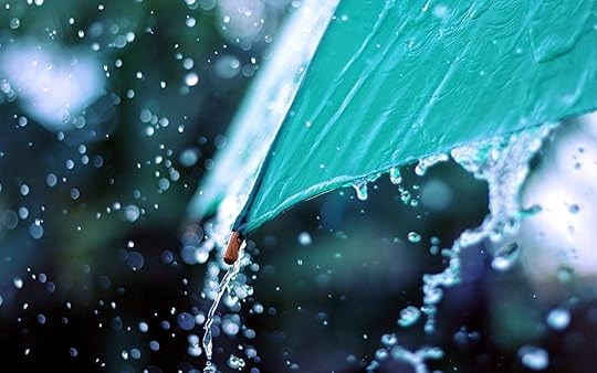 I watch her walk in the rain, the blue umbrella in her hand threatening to fold backward any moment in the wind. She is dressed in an emerald green dress, but it's wet, clinging to her curvaceous body, the shade in the dark looks almost black.