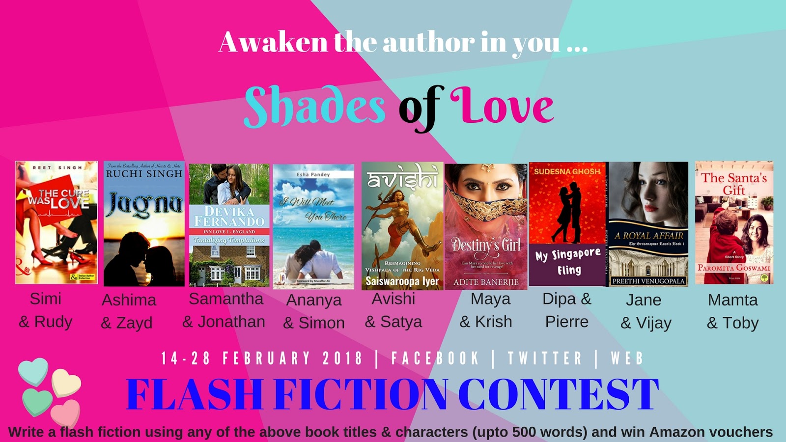 Happy Valentines Day!It is that time of the year to awaken the sleeping romantic inside you!Nine popular Indian authors invite you to write flash fictions during this month of love and stand a chance to win Amazon vouchers.Happy to announce an exciting Valentine-month contest for every aspiring romance author!