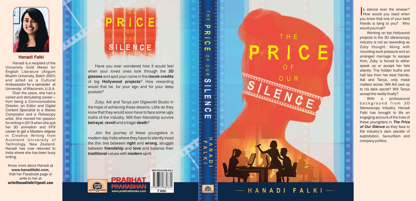 Is silence ever the answer? How would you react when you know that one of your best friends is lying to you? Who would you trust? Working on top Hollywood projects in the 3D stereoscopy industry is not as rewarding as Zuby thought. Along with mounting work pressure and an arranged marriage to escape from, Zuby is forced to either speak up or accept her fate silently. The hidden truths and half lies from her best friends, Adi and Tanya, only make matters worse. Will Adi owe up to his dark secret? Will Tanya accept the reality finally? With a professional background from 3D Stereoscopy industry, Hanadi Falki has brought to life an engaging account of the lives of these youngsters in The Price of Our Silence as they face to the industry's dark secrets of exploitation, favouritism and company politics.