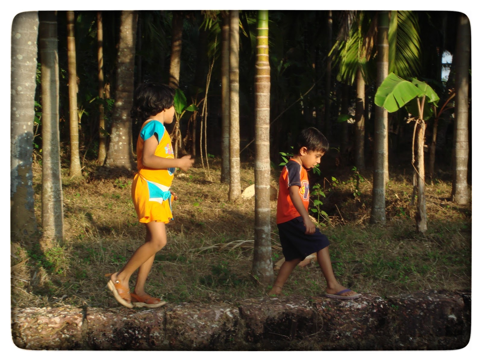 A walk through the paddy fieldsMy son enjoyed the trip the most as he had a roller coaster ride, cozily perched on my hip. He would squeal and laugh whenever I slipped in the slush and splashed mud all over my skirt. Twice my slippers got stuck in the mud. We somehow managed to reach the coconut and palm grove which bordered the field and from where a pukka concrete road led towards our house.