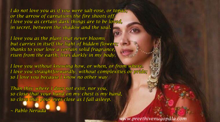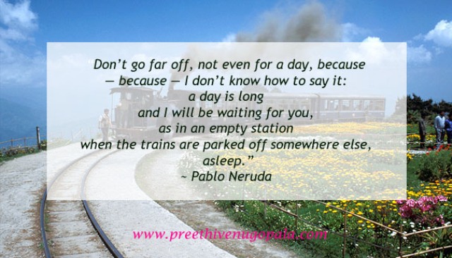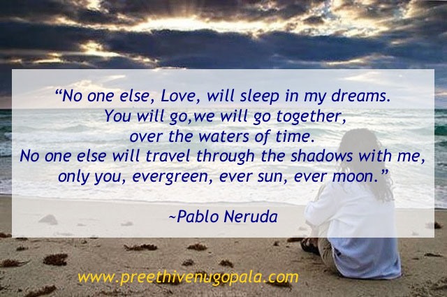 Neruda’s poems have a way of getting embedded into your very being. They are soulful, filled with positivism and honesty. I love almost everything written by Pablo Neruda.