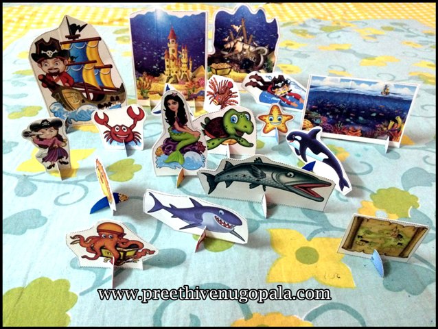 When I found characters hiding in the Colgate toothpaste wrappers, I immediately asked him whether he would like to create his own story. He was ready. I cut out the characters and made them ready for taking on their role. His father also takes the seat in front of the tiny story teller. When he begins, we are mesmerized. We were in for a treat when the ready-made character cutouts starred in his story.This is the story that he tells us.