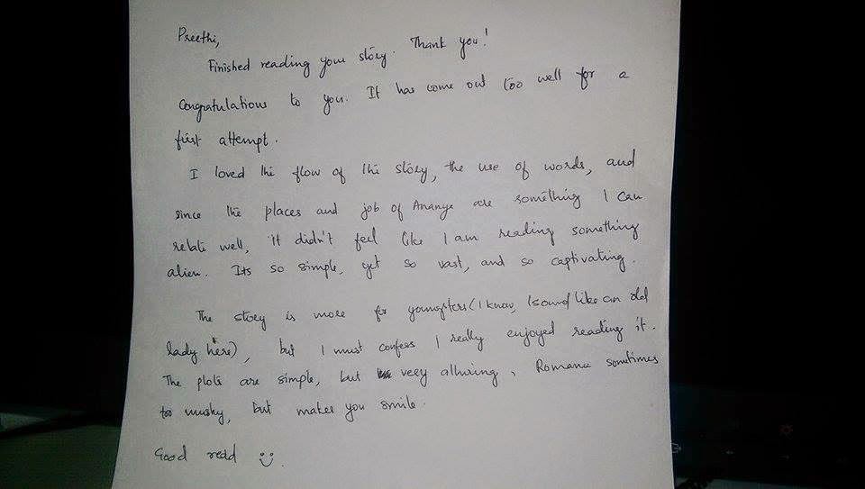 Happiness is the first review of your bookHappiness is your passion Happiness is when your work is appreciated. Happiness is also when we follow our passion.Happiness is when readers take time to give their reviews to stories that I have written. Happiness is when a friend takes time to read a your 60K manuscript, writes in long hand a review about it on paper, take a photo of it and post it in your Facebook inbox. Happiness is also when a short story you were writing attains denouement after giving you headaches for days together.
