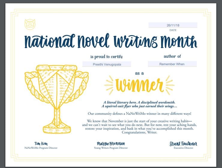 Nov 26: Completed my first NaNoWriMo Novel 'Remember When' and was declared a winner. I am currently polishing and editing it. Hoping to publish it by late January.