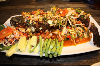 Our anniversary meal will be "Bla Lui Suan" (literal translation: Fish Invades a Garden), which is delicious fish covered in a spicy nut mixture and surrounded by vegetables. I'm always too hungry to take a picture of it when it's ordered, but it looks kinda like this: