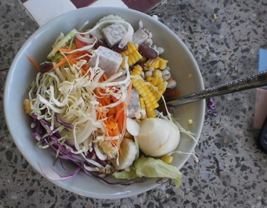 What am I up to today? Eating Delicious Salad! As everybody knows, vegetables are brain food. And the working writer needs all the help he can get. (Isn't fish brain food?) Shut up.