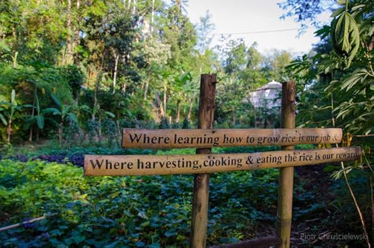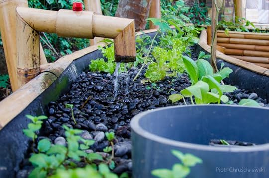 My tour started in the hydroponic garden, where water from the river was being pooled to create tanks. Fish swim in the tanks, eat and excrete waste, and that waste is then pumped into gravel planters, where a variety of plants are grown for research, eating, and other uses by the students. Adjacent to the hydroponic garden were several food plots where students learn to cultivate their own fruits and vegetables for school meals.