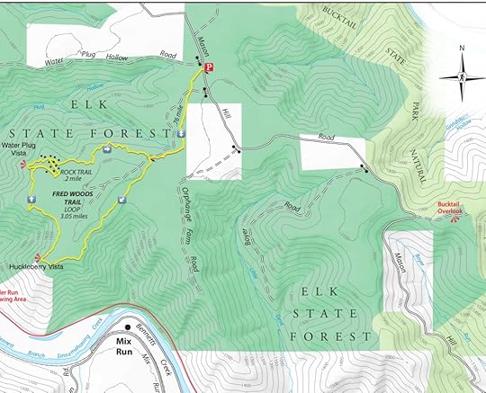 Parking for the Fred Woods Trail is at about 41.362360, -78.183133. Bucktail Overlook is at 41.349790, -78.153461.