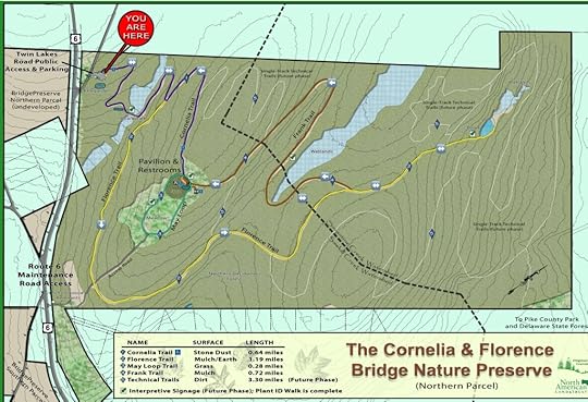 The Bridge Preserve is a great place for an easier hike with rolling and level terrain, winding trails, and good scenery. Many of the trails are wide and trail junctures have signs. The forests are mostly hardwoods with glades of ferns and some laurel.