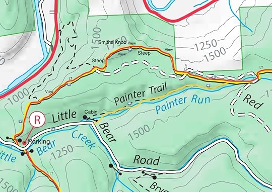 From the parking area, hike up Little Bear Road for about three quarters of a mile. Turn left onto the yellow blazed Painter Run Trail and hike behind a cabin. Follow the trail into the woods and along scenic Painter Run. Hike up along the run with many cascades and mossy rocks. In summer there are wildflowers. Cross the creek a few times by hopping on rocks. The surrounding forest is a mixture of hemlock and hardwoods. It is a gradual climb along the run and very scenic. At the top, make a sharp left onto the Loyalsock Trail (LT).