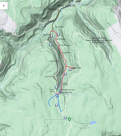A few things about this hike- there is no trail along Somer Brook, just follow it upstream. You will have to cross the creek many times, so expect wet feet. Do not attempt in high water, as Somer Brook becomes a ferocious whitewater torrent. It is best to park at the “High Knob Trail parking area” as shown on Google maps. But this is only accessible during hunting season. The road is in decent shape, but a vehicle with some clearance is recommended. There is year-round access from Windy Valley/Bellasylva Road via the Swinging Bridge or Meat Trails. However, you must cross Mehoopany Creek without a bridge. If Somer Brook is high, you do not want to even consider crossing Mehoopany Creek. This description begins from the “High Knob Trail parking area”. This hike is roughly 9-10 miles in length. It is challenging, incredibly beautiful, and should only be attempted by experienced hikers. It’s a good idea to bring a friend.