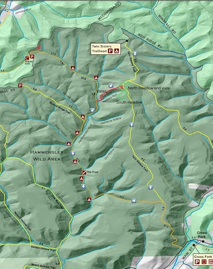 From the parking area, head south on the Twin Sisters Trail, it is blazed yellow but there are also orange blazes. It is a scenic trail with hemlocks, large hardwoods, and gradually climbs a ridge. It follows an old grade as it hugs the side of the mountain. You will soon reach the Twin Sisters Vista, aka Hammersley Meadows, large meadows formed by wildfires. These meadows offer superb views.
