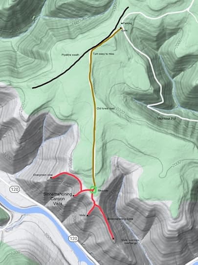 Parking is at 41.325439, -78.042667. Sinnemahoning Canyon Vista is at 41.302421, -78.051076. The other vista is at 41.300120, -78.048657. Sinnemahoning Spine is at 41.296699, -78.044167.