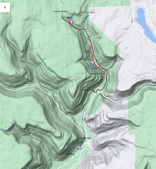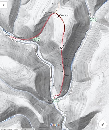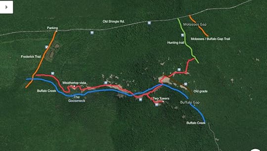 For the map above, red is off trail. However, the woods are open and walking is fairly easy, although steep down to the vistas. Brown is an old forest road. No trails have blazes or signs.
