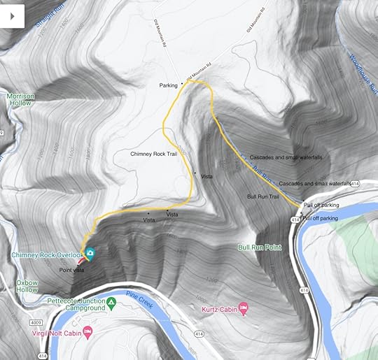 Chimney Rock Overlook is impressive with its views of Pine Creek, and the ridges, peaks, and plateaus that surround it. The terrain is diverse and beautiful. Hundreds of feet below is the rail trail and a bridge across the creek. There is a flag at the view. This view is great for sunrises.