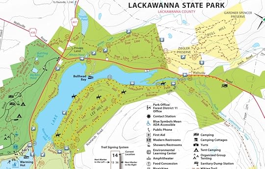 Lackawanna State Park has miles of hiking and mountain biking trails. While there aren’t mountainous vistas or towering waterfalls, I enjoy hiking here due to the diversity of habitats and scenery. The many trails create numerous loop options. This loop circles the northern half of the lake and is about 5.5 miles long. It has streams, meadows, views of the lake, and lots of hemlocks. Most trails have signs and many trail junctures are numbered.