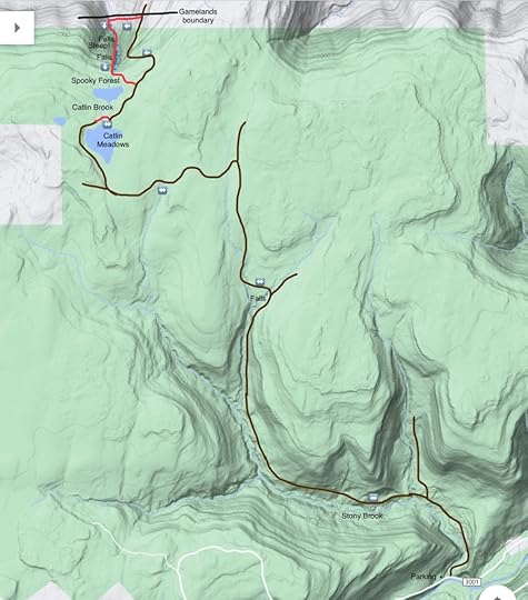 For the map above, red is off trail and brown is an unblazed but established trail. The map is for general directional purposes and does not represent an exact GPS track.