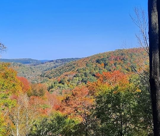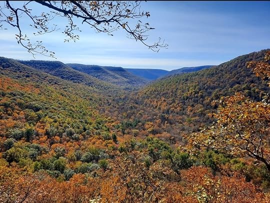 The laurel recedes and the forest becomes open. Stay along the same approximate elevation. Reach the view, it is located approximately at 41.484412, -77.020635 . The view is impressive, looking down the isolated valley of Grays Run with a series of furrowed ridges. It looks south. The best times for this view are morning when fog might linger in the valley, or sunset when light shines on the furrowed eastern wall of the valley. Return the way you came.
