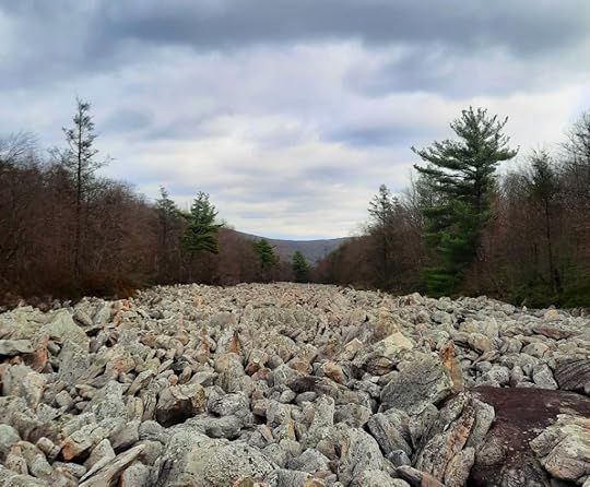 Reach a juncture with the yellow HST at a monument and turn right onto it. Descend into a valley. Pass a faint red trail to the left. Cross the wooded end of the race course, you can hear water flowing under it. Reach Stagecoach Road or Rattling Run Trail, turn right on it. This is not blazed, but is obvious. Climb and when the road begins to level a little, keep an eye out for a red trail on the right, take it to the race course. Devils Race Course is impressive, it looks like a glacier of rocks. It is long and narrow, with a sizable creek flowing under it. The water is so deep under the rocks, we only saw it once. There are giant boulders. Apparently, the name came from the sound of the water, as if the devil was racing underground. The red trail continues on the other side, I don’t know where it goes. There is also a nice view down the race course.