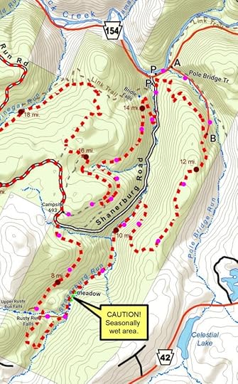 Description: This isolated loop is ideal for those looking to explore somewhere different, it combines a variety of trails to make an enjoyable loop. From the parking area, hike up Route 154 to a cabin on the right. Don’t go up the driveway, rather punch through the hemlocks to the left of the driveway (Point A) and follow a grade. This is the old Pole Bridge Trail, which is blazed red. While officially abandoned, it still exists and is fairly well blazed. Follow the grade high above the creek. Enter hemlock forests with some large trees. There are blowdowns along the trail. The creek comes closer, but you need to hike off trail to see it. There are many cascades and rapids, but no large falls. Regardless, Pole Bridge Run is beautiful with a primeval, isolated feel.