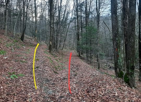 From the AT parking lot, head north on the trail and cross Clarks Creek. The trail veers left off a forest road and climbs gradually. Pass a juncture with the red Knauber Trail on the right, this will be your return route. Continue on the AT as it gradually climbs the mountain on an old road, passing old collapsed mines. Near the top, notice a yellow trail to the right. I don’t know where it goes, but it might connect to the trails that cross the Devils Race Course, described later.