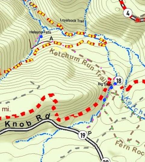 Description: This enjoyable hike visits cascades and falls most hikers overlook. From the parking area, follow the Ketchum Run Trail under hemlocks and along a creek. After about a quarter mile, look for the Fern Rock Nature Trail, blazed yellow with a blue fern, turn left on it. Hike along Ketchum Run with a falls and cascades, it is scenic. The nature trail moves away from the creek. Here, go off trail and follow Ketchum Run downstream where you will see the Big Slide and other cascades. The slide is impressive. Reach the red bridle trail and turn left, crossing Ketchum Run. Veer right onto the Ketchum Run Trail, which is along an old grade. Pass a log cut like a toilet seat. Reach the Loyalsock Trail (LT) and veer left.