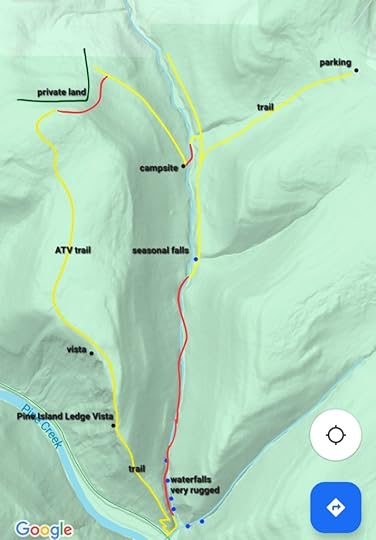 Description: This is an excellent loop in the Pine Creek Gorge you didn’t know existed. It serves as an ideal alternative to the popular Black Forest Trail (BFT). This loop is easier than the BFT, has more waterfalls, cascades, creeks, and water features, but has fewer views (though there are still quite a few views).