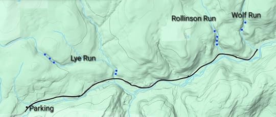 Terrain: Generally easy to moderate. Must hike along creeks. Rollinson Run is somewhat gorged in and requires hiking, climbing along waterfalls.