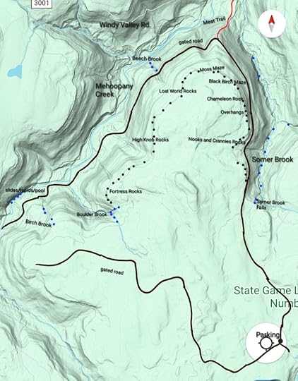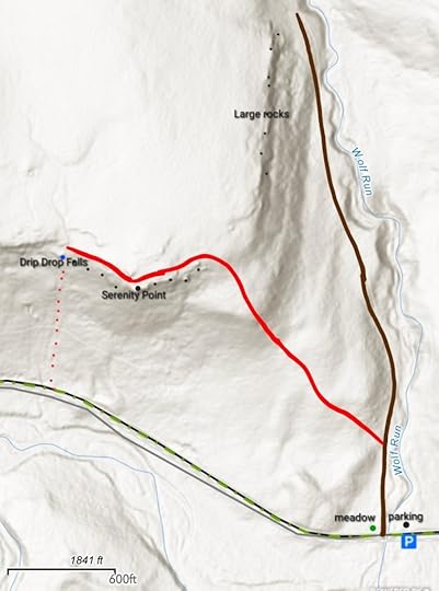 On this hike, I also explore large rocks above Wolf Run, as indicated on the map below.