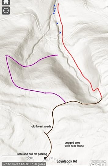 Trail conditions: This is an off trail hike, except for the gated game commission roads. Thankfully, on my hikes, the brush was not bad, other than saplings. There is little mountain laurel. The gated road on top of the plateau has wet and boggy areas. Only experienced hikers comfortable with off trail hiking should attempt. Use a navigation device.