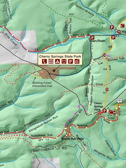 Now you have a choice. I suggest you take the purple shortcut on the map below. I hiked the EFT on the railroad grade to the STS. It’s nice, don’t get me wrong, the grade was cool and the hiking was mostly level to the STS, but there isn’t much scenery to justify the effort, especially since you must descend and then climb up from the grade on the STS. The purple route does miss Cherry Springs Vista, but Boone Run Vista is a better view anyways.