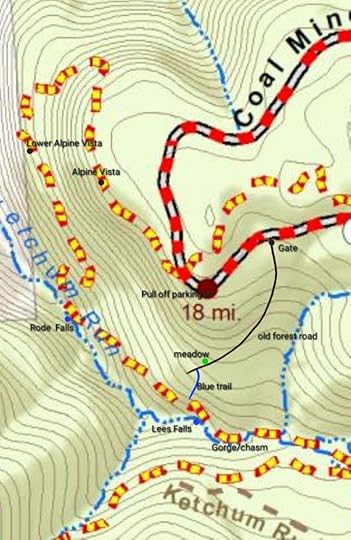 From the pull off parking, with your back to the pull off, go left on Coal Mine Road. Reach a sign for the LT, go left. Reach stunning Alpine Vista with a dry campsite. Follow the edge of the gorge and make a steep descent to equally beautiful Lower Alpine Vista. Snakes are often here in hot weather. This part of the trail is often wet. Continue on a somewhat steep descent to Ketchum Run on the LT (don’t take the ladder bypass trail if you want to see Rode Falls).