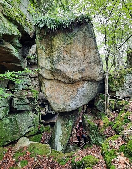The escarpment, or the Realm of Rocks, noted by the black dots on the map, is impressive. Thankfully there is no thick brush, other than saplings, although the terrain is rugged. The route follows the top escarpment of the plateau. If you love rocks, this is the place for you. There is no other place like it in PA, with rock features for miles. There are huge overhangs, chasms, caves, grottos, and boulder cities clothed in moss. I loved all of it. Chameleon Rock is very interesting, with a huge “arm” of rock with the profile of a chameleon. My favorite spot is the Moss Maze, an amazing maze with giant mossy boulders. I also loved Black Birch Maze and Lost World Rocks. Portal Rock is in Lost World Rocks.