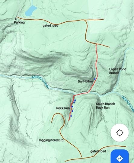 Access: closer access may be possible from the gated road at the bottom of the map below, or south of Rock Run. It may be open in hunting season, vehicle with clearance is recommended. As Rock Run is the highlight, this would be the best access.