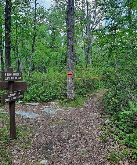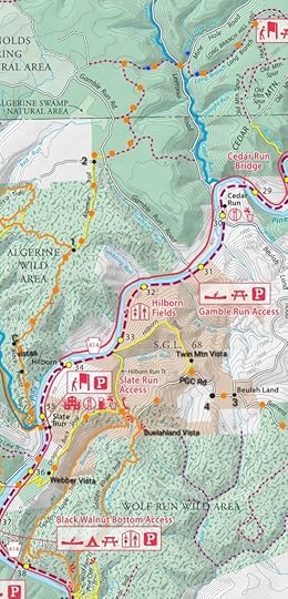 From the Slate Run parking area, cross the bridge and pick up (turn right onto) the BFT behind the Hotel Manor. Cross beautiful Slate Run on a bridge and climb the ridge with rock outcrops and pine seedlings. Reach two views at old quarries with more rock outcrops. There is superb dry camping at the second view. Reach the top of the plateau with mountain laurel, pass a spring. Where the BFT goes left, go straight onto the Algerine/Long Branch Trail (LBT). (Point 1 on map).