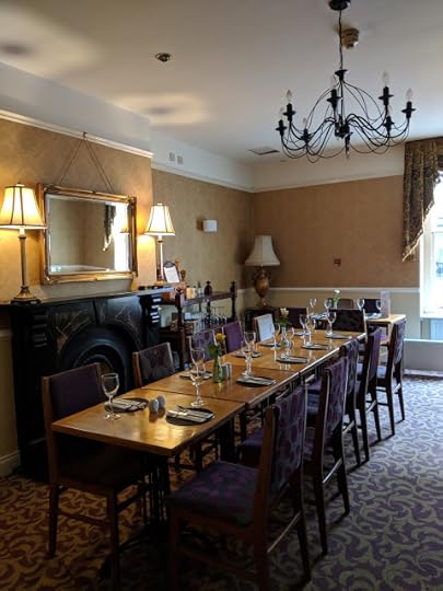None of us had expected such a good turnout, but Mulberry Bistro rose to the occasion feeding and watering everyone as needed. Nerves had prevented me from having a big dinner but a tasty caramel square and a coffee set me up. All in and settled, it was time for our first reader.
