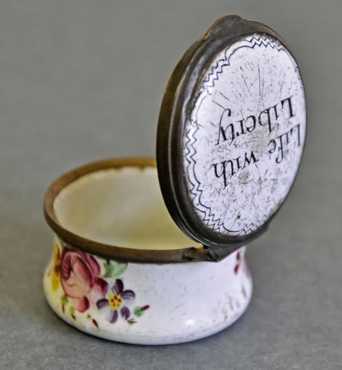 Photograph courtesy of the Armagh County MuseumThe little patch box (number 17), though tiny, spoke of much bigger issues. This little box was used to hold the beauty spots that women wore on their faces. If you read the pamphlet that accompanies the exhibit you'll learn from the clues on the container that this may have been quite the radical item to receive or gift to a secret lover perhaps! Find out more yourself at the museum.