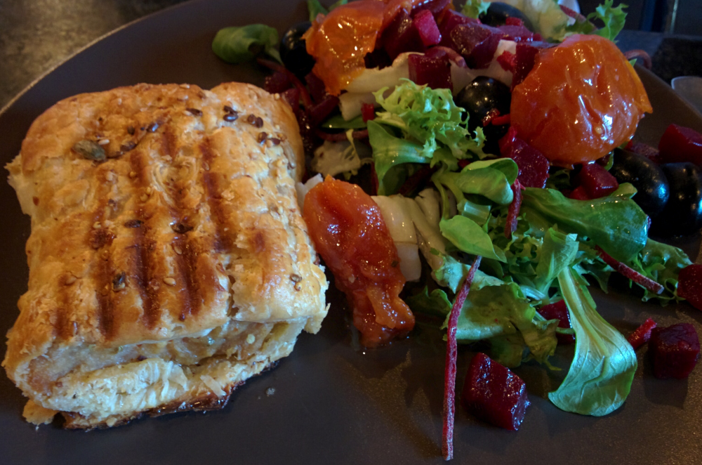 I had a panini with bacon, cheese and tapenade, with a side of salad ingredients of my choice.