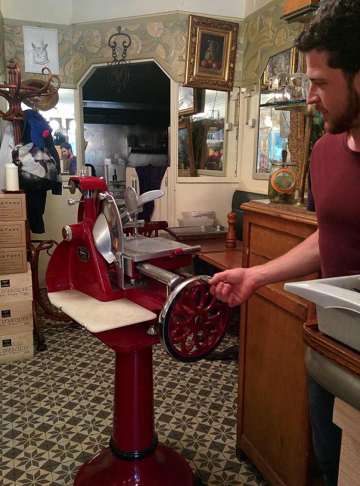 ... by the friendly staff... here Thomas is showing me that the old meat slicing machine still works. It was lovely to see the pride that Thomas has in the business, great to see a new generation valuing the merits of the past...