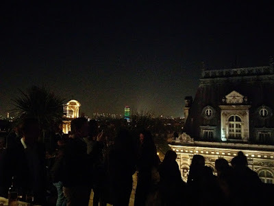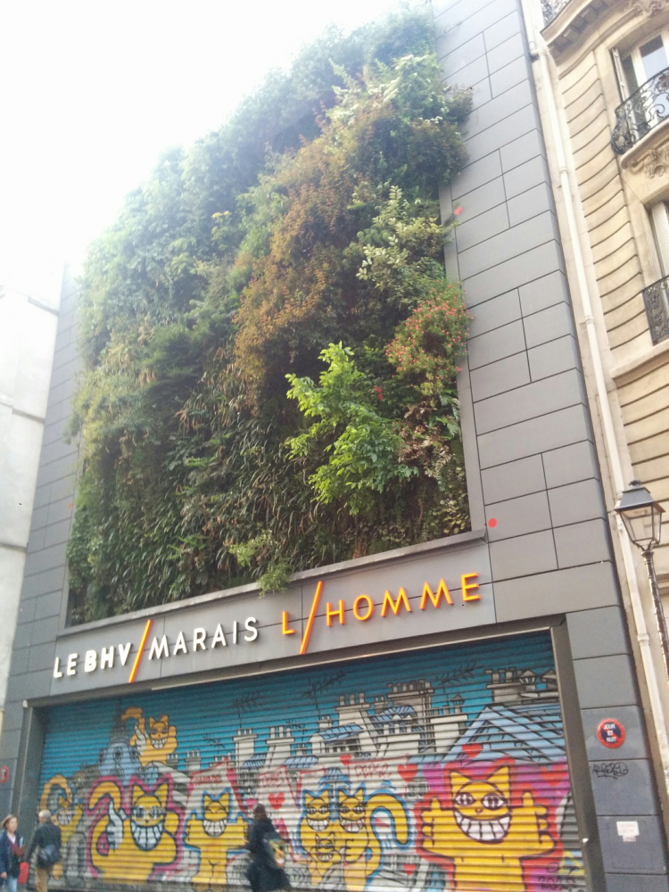 We decided to get into the queue and see how far we'd get in thirty minutes - then we'd go home knowing the approximate rate of flow of the line. I wasn't really dressed for posh rooftop drinking and hadn't even put on any makeup. The other people in the line were mostly between 20 and 30 years old with a sprinkling of some older foggies such as us.While we stood in the line, we had a nice view of a rather spectacular vertical garden across the street. The street art was quite good too.