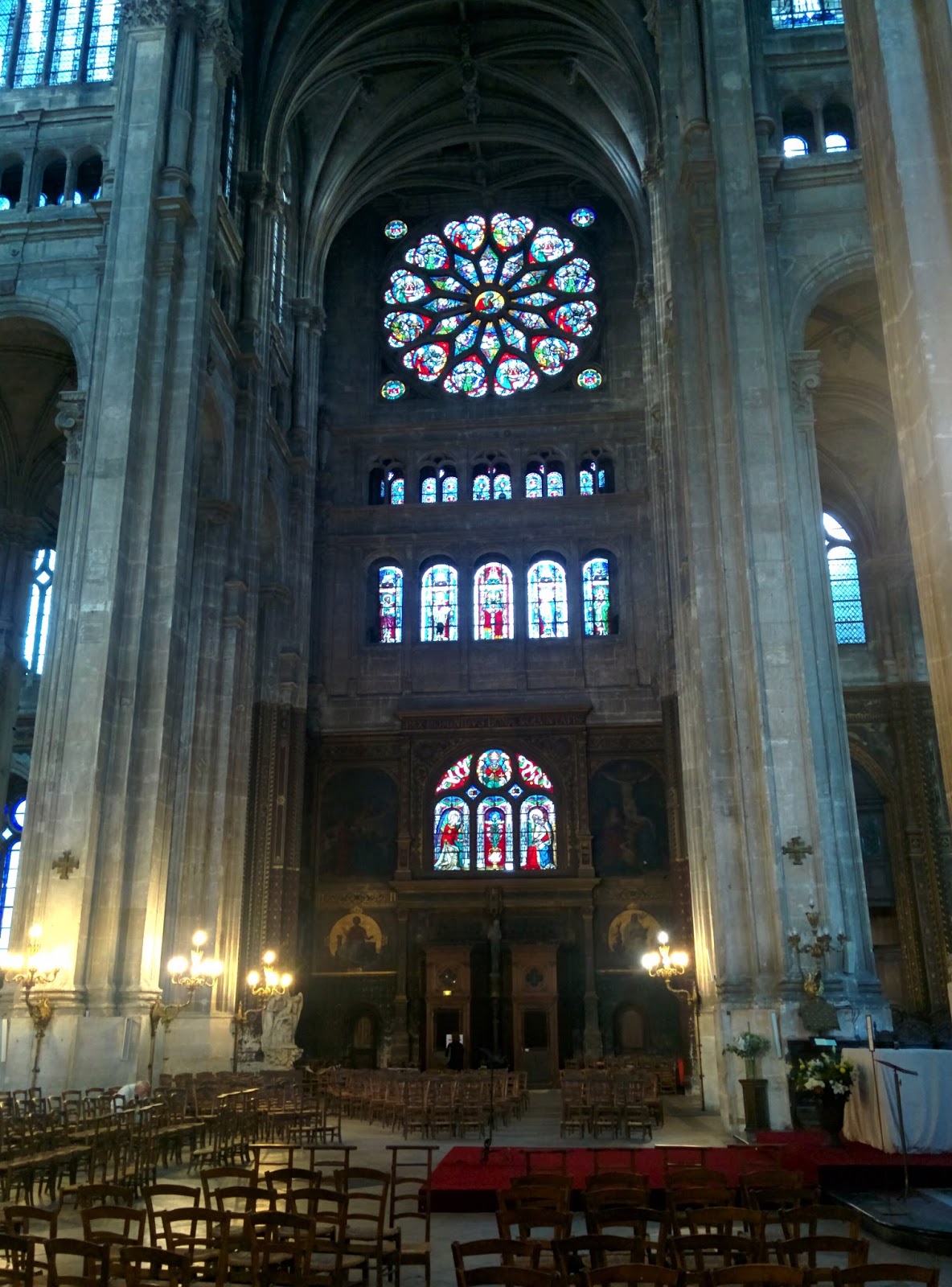 Another close-by church is St Eustace - we happened to wander in during auditions for a new organ player. The sound was amazing - made my skin goose bump and threw a surge of emotion at the back of my eye lids! Unfortunately, I didn't record it but I do have a pretty picture of its rose window.
